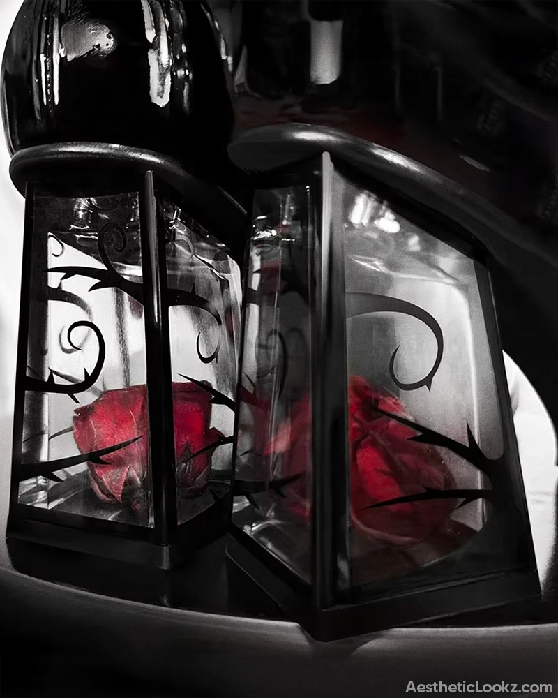 Featuring a glossy vegan leather finish and a transparent block heel encasing a red rose, these heels blend gothic allure with timeless femininity. Their double Mary Jane straps with gemstone accents add a touch of sophistication and elegance. Pair them with black tights and a gothic mini dress for a perfectly haunting look.