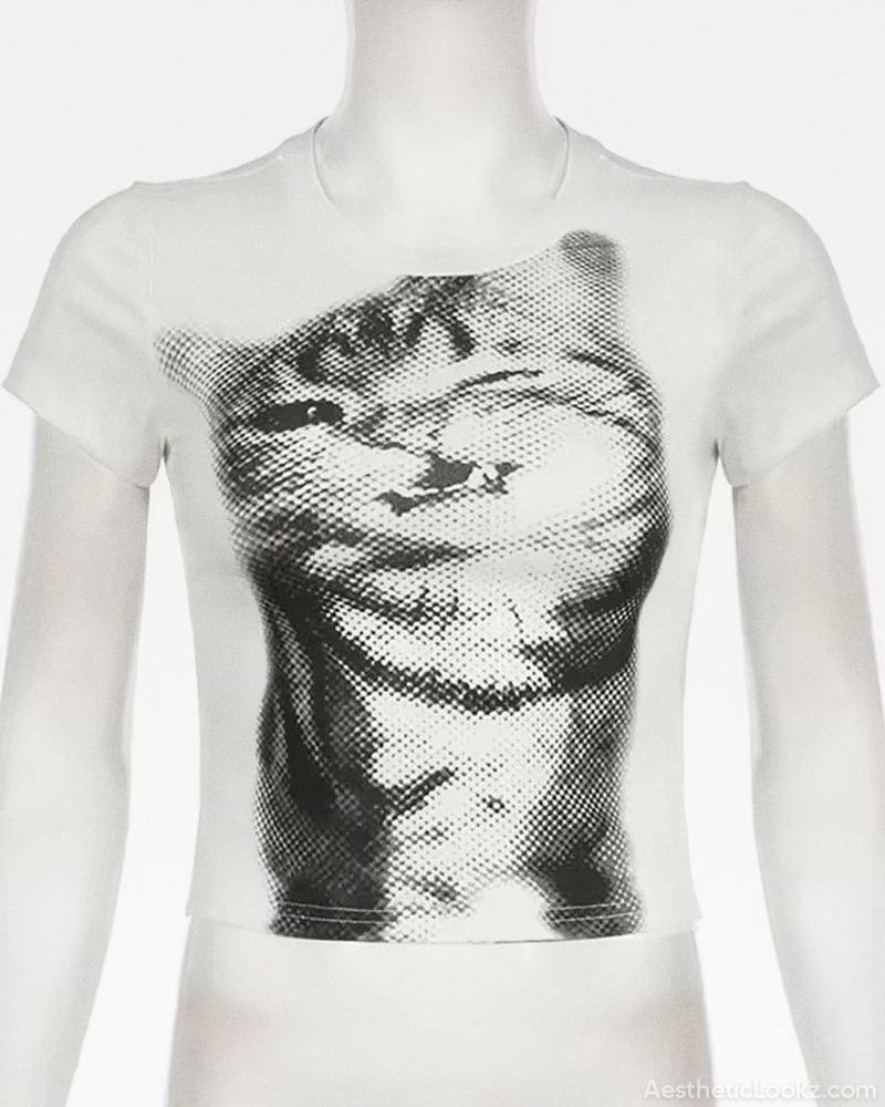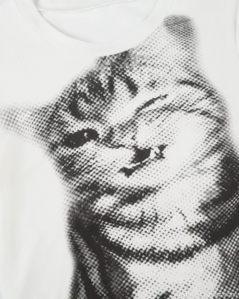 Designed with a fitted cropped silhouette, this Cat Crop Top features a bold black and white cat graphic that instantly draws the eye. Its lightweight polyester fabric feels soft on the skin while keeping the silhouette sleek. Style it with low-rise jeans and chunky accessories for a sharp Y2K-inspired look.