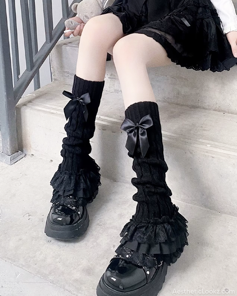 | Acrylic Knit leg warmers with bow detail Layered lace ruffle hem Soft | stretchy fabric Easy slip-on design 2 colors available Add a soft touch to your outfits with our Lace Ruffle Leg Warmers Designed with a cozy knit base | these leg warmers showcase elegant bows and a ruffled lace hem for a refined yet playful finish. Their flexible fit makes them effortless to wear and style. Style them over sheer tights with a pleated skirt for a perfect kawaii vibe. |
