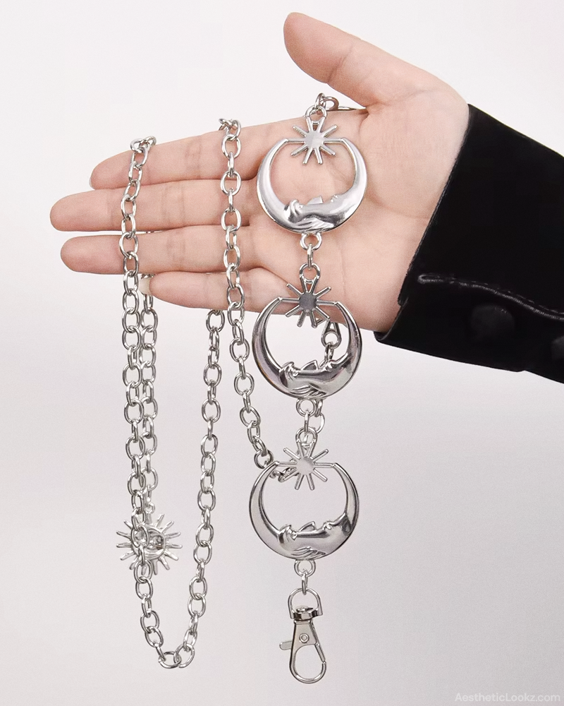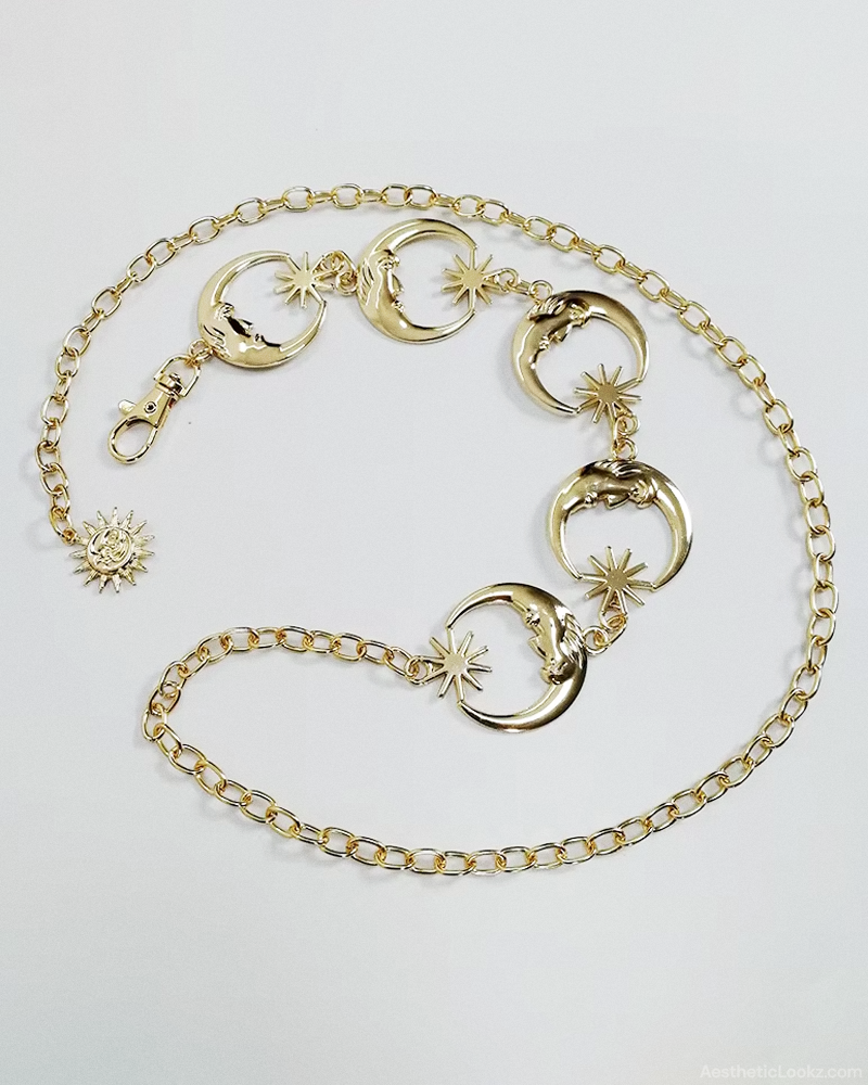 Our Sun And Moon Belt brings a cosmic touch to any outfit with its linked chain design featuring intricate moon and star charms. Made from lightweight alloy and featuring an adjustable lobster clasp closure, it's both stylish and comfortable for all-day wear. Style it over jeans or drape it around a dress to instantly elevate your celestial-inspired look.